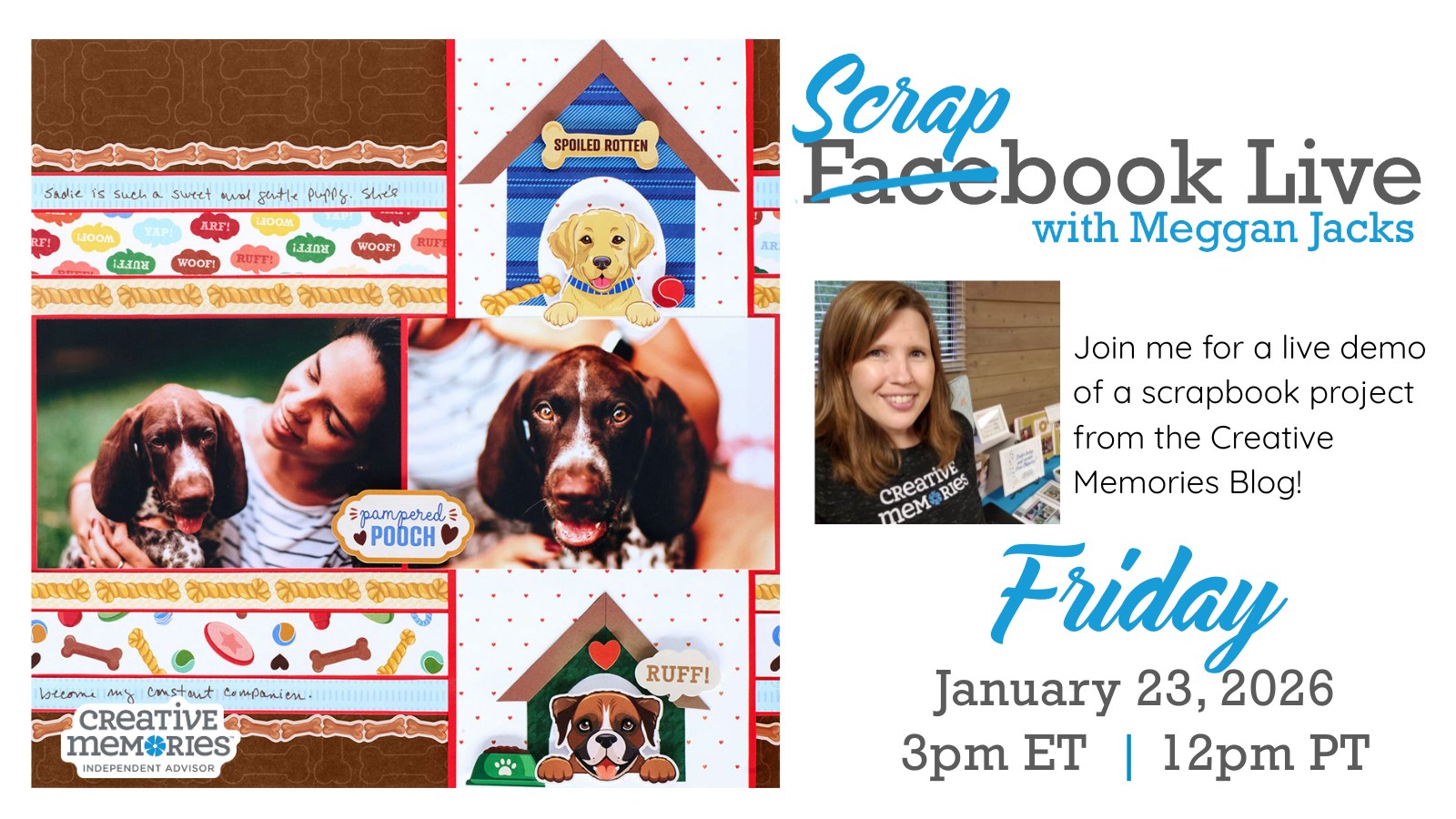 For this episode of Scrapbook Live, I will be creating a single-page layout inspired by a project from the Creative Memories blog. The original layout features the Ruffin’ It collection, Creative Memories’ latest pet-themed release.